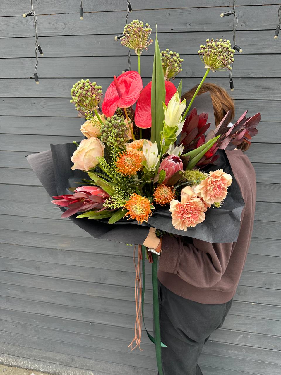 склад букету залежить від сезону, в основі антуріум, левкодендорн, левкоспермум, піоновидна троянда (складові прохання уточнювати у флориста)