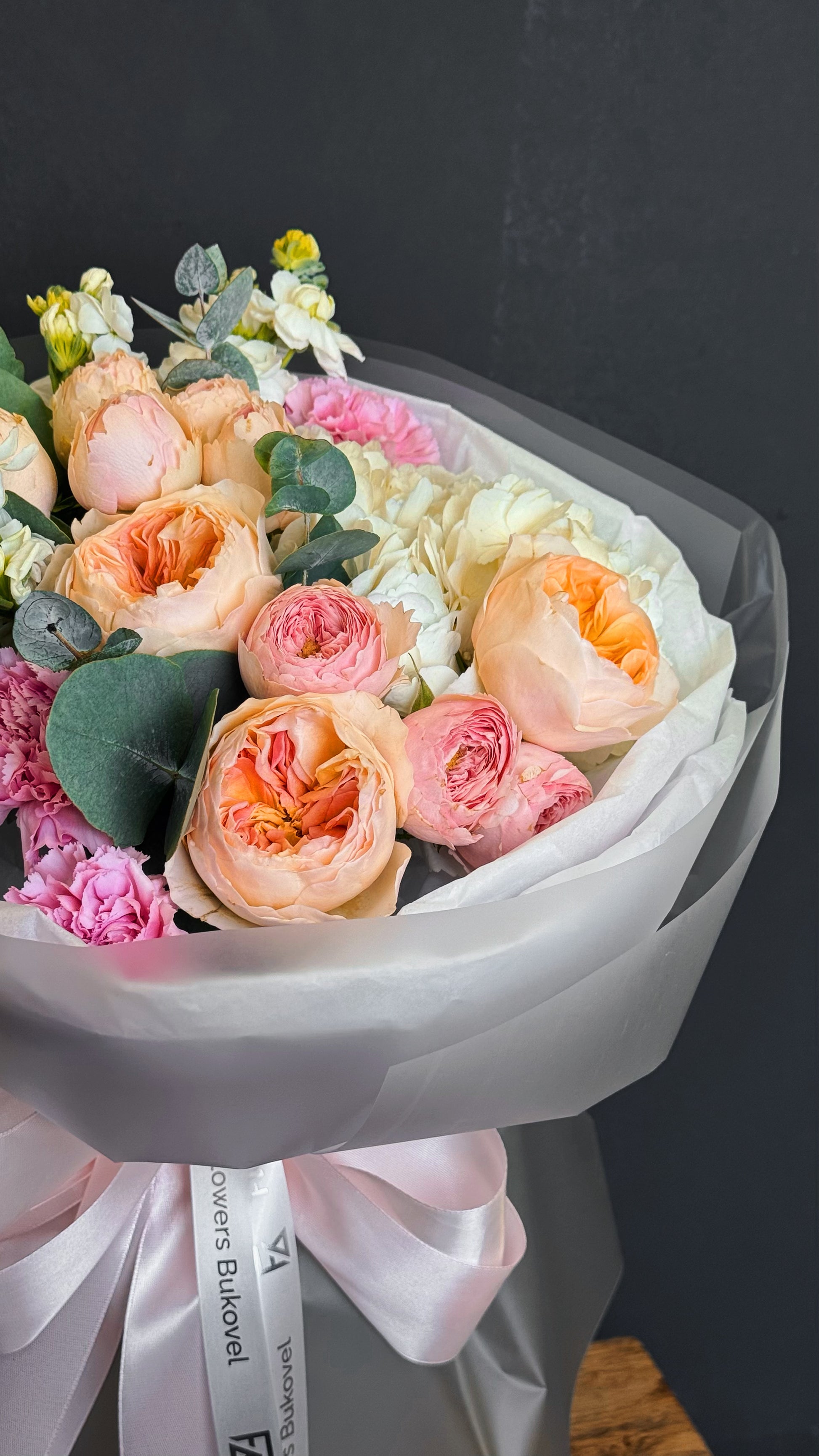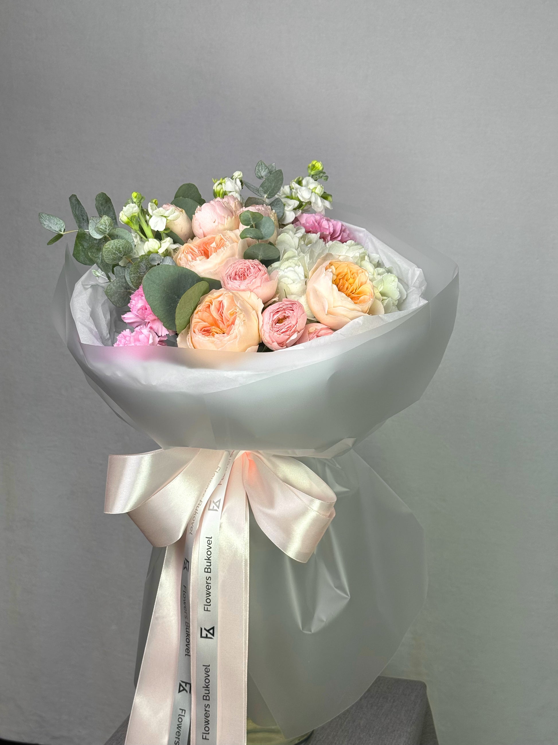 склад букету: гортензія 1 шт.,піоновидна троянда 3 шт., кущова троянда 2 шт., гвоздика 3 шт., матіола 3 шт., евкаліпт 2 гілки., упакування тішью+калька