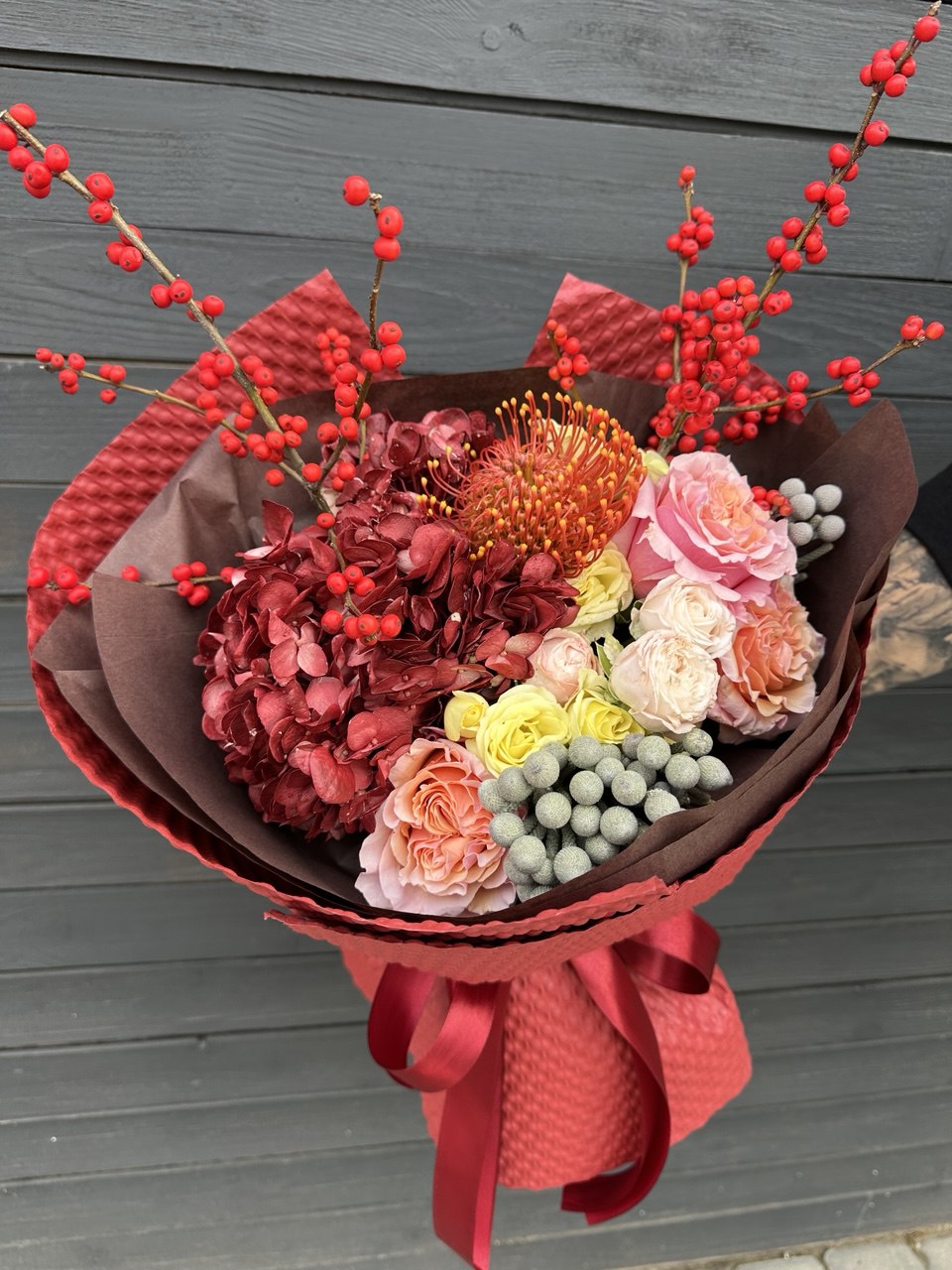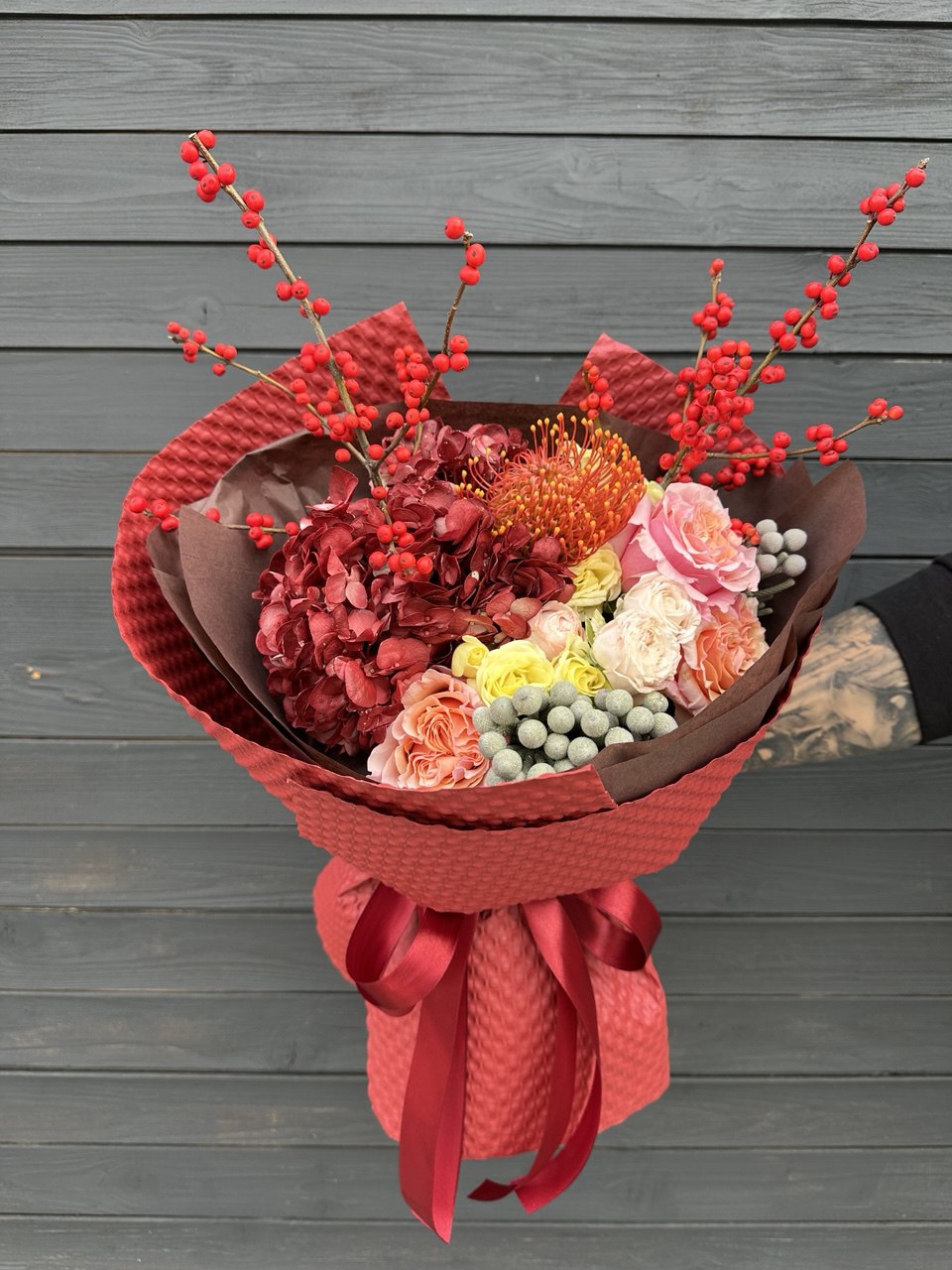 Склад букету - гортензія, кущова троянда, піоновидна троянда (по іншим позиціям, може бути заміна)