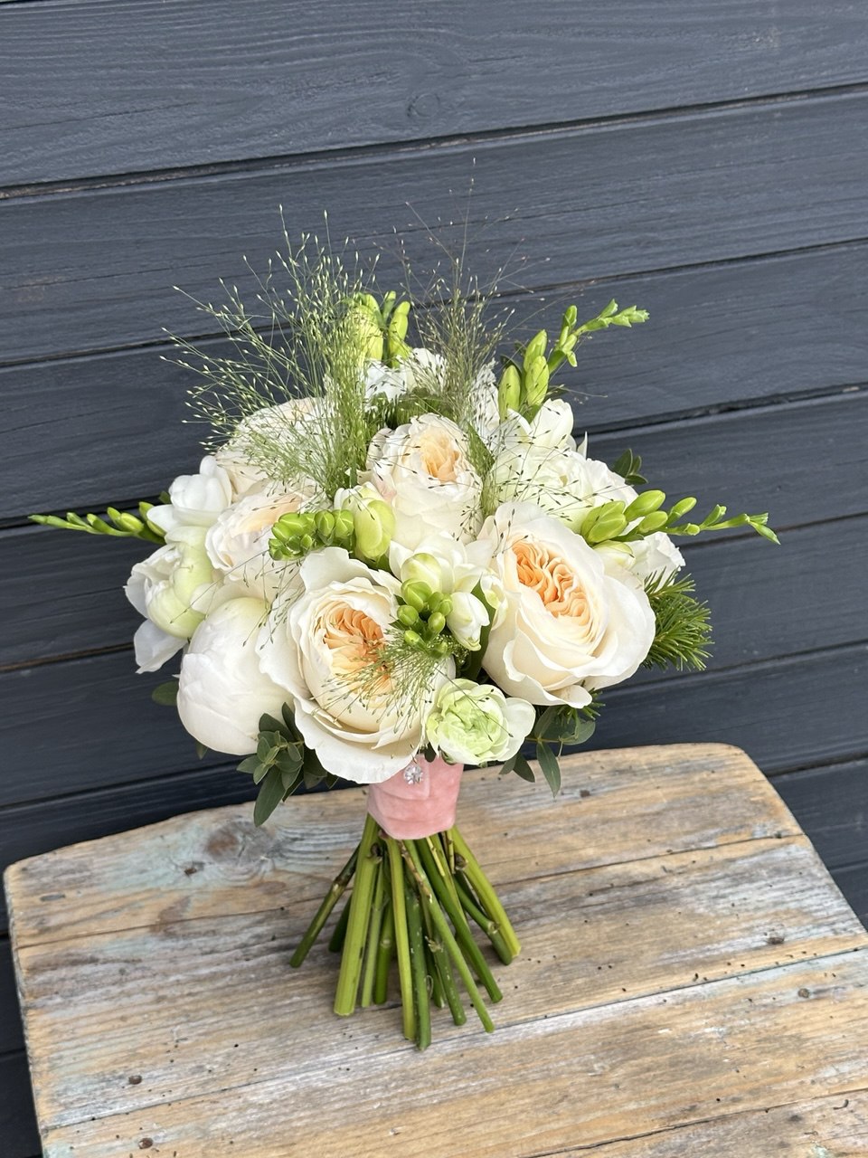 весільний букет біло-персиковий, в складі: фрезія, білий піон, анеглійська садова троянда, панікум