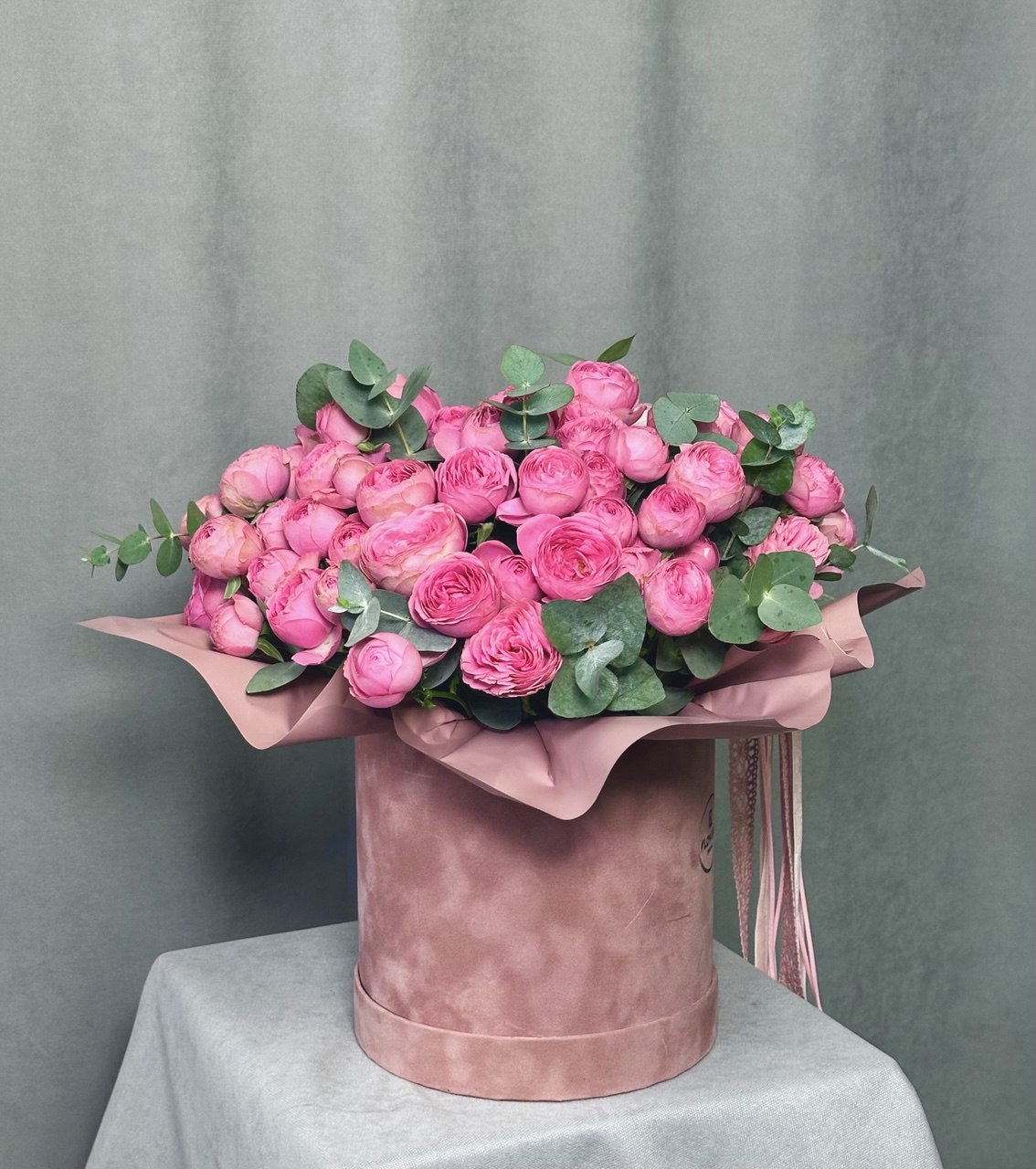 склад: коробка велюрова, 17 гілок кущової троянди (колір коробки та троянд уточнювати)