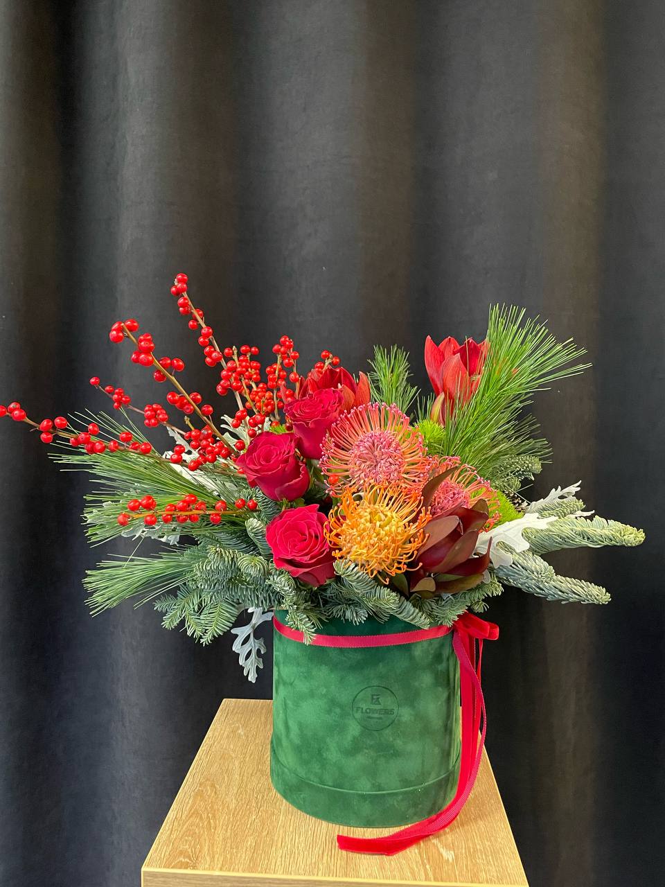 склад: велюрова коробка, троянда, ілекс, ялинка "нобіліс", левкодендрон, левкоспермум, тюльпан, пінус, евкаліпт, штучний сніг